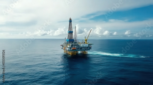 Oil platform in open ocean with calm waves and bright skies, showcasing vastness of sea and impressive structure of rig