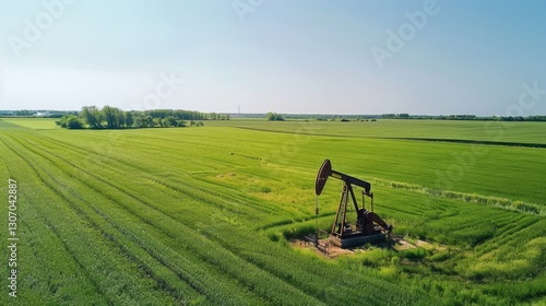 Oil Pump Jack Working in Expansive Green Farmland Under Clear Sky