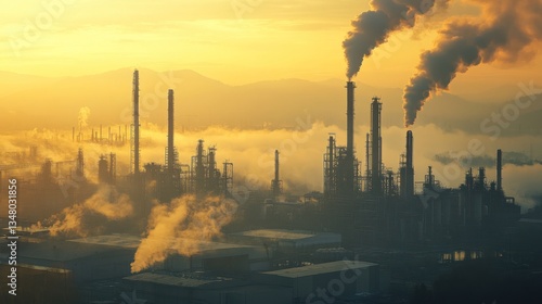Oil Refinery at Sunset: Industrial Landscape and Pollution