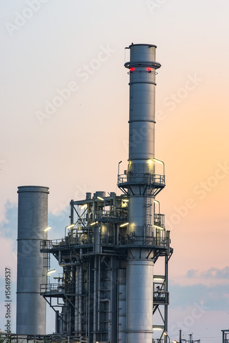 Oil refinery towers and steel pipes at dusk. Maasvlakte, Europoort, The Netherlands