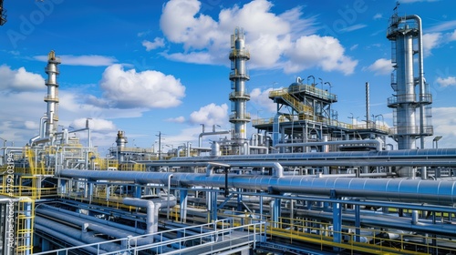 Oil Refinery Wallpaper, Striking Industrial Panorama with Vibrant Blue Sky and Intricate Piping Architecture