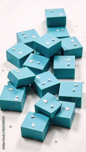 Ok Artistic arrangement of blue cheese cubes on a bright white background
