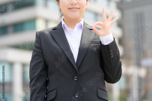 ビジネススーツの女性が右手でOKサインをつくる明るく清潔な印象の1枚