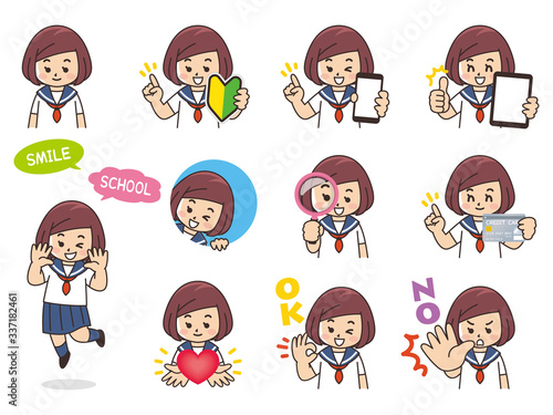 夏服の女子高生バリエーション 初心者マーク スマートフォン タブレット 虫眼鏡 クレジットカード ハート OK NO
