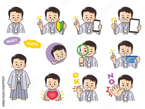 紋付袴を着た花婿 新郎 結婚 バリエーション 初心者マーク スマートフォン タブレット 虫眼鏡 クレジットカード ハート OK NO