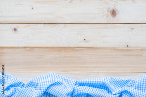 Oktoberfest background with blue tablecloth Bavarian check pattern on white wood table for Germany national festival beer and food party celebration