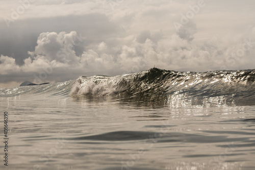 Ola quebrando en el mar, en una mañana nublada, con reflejos del sol en el agua.