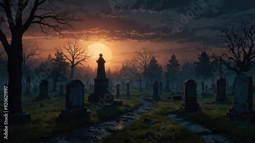 old abandoned cemetery at dusk, gloomy atmosphere