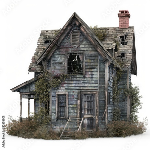 Old abandoned house is falling apart with broken windows, overgrown shrubs, and peeling paint