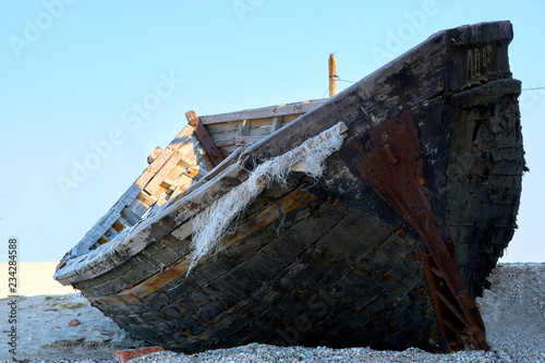 Old abandoned wooden fishing boat with rusted nails by the sea