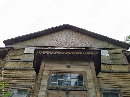 old and abandoned wooden building against the gray sky. bottom up view photo.