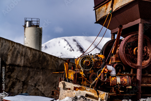 Old and rusty yellow engine attached to a larger decommissioned machine in an abandoned industrial park in a mountain covered landscape.