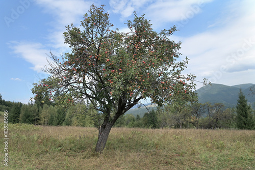 Old apple tree with ripe apples in a mountain landscape.