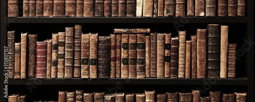 old books on wooden shelf.