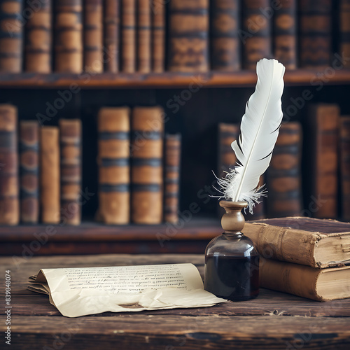 Old books, quill and inkwell on a wooden table.