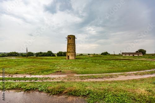 old brick tower standing on the outskirts of the village by a dirt road after rain