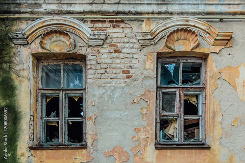 Old broken windows of abandoned mansion