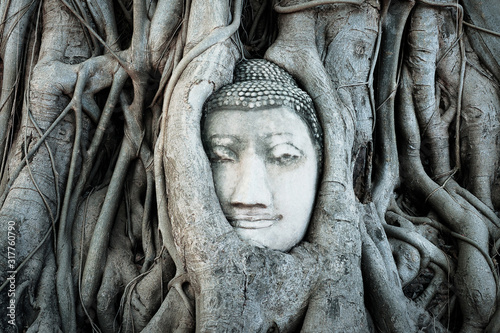 Old buddha head trapped in bodhi tree roots in Wat Mahathat Temple, Ayutthaya. Bangkok province, Thailand