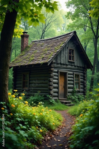 Old cabin in the woods, weathered wooden exterior, overgrown garden, and a dense thicket of branches surrounding it, dark wood, seclusion