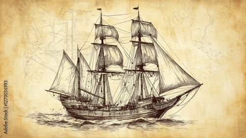 Old caravel, vintage sailboat. Hand drawn sketch. Detail of the old geographical maps of sea