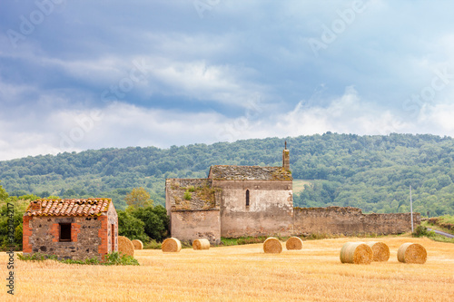 Old church in central Burgundy with heystack, France