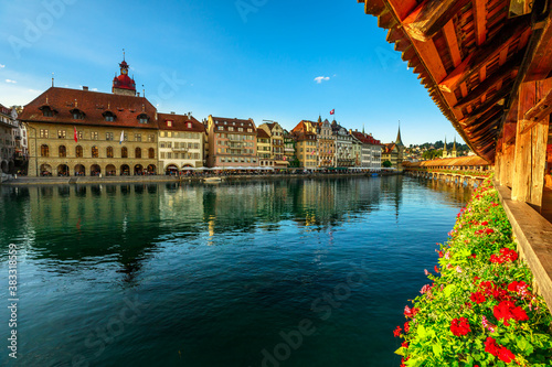 Old city center of Lucerne on Lake Lucerne, Switzerland. Kornschutte or town hall from historic covered wooden Chapel Bridge with Water Tower and flowering geraniums reflecting on Reuss river.