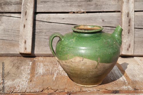 old clay jug kettle, a vessel with a neck and ceramic handle