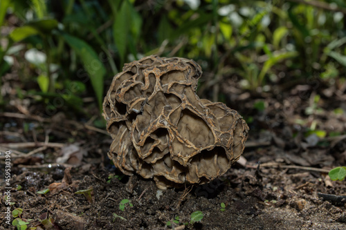 Old Common Morel fungus or Real Morel (Latin: Morchella esculenta) closeup. Soft blurry background.