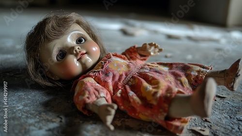 Old Doll Lying on Dirty Floor with a Vintage Dress