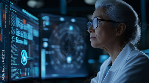 Old elderly Female learning IT tools, old IT specialist, information technology, Data room