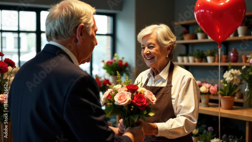 Old elderly gray- haired woman florist in a white shirt and brown apron hands a bouquet of flowers to an old gray-haired man in a blurred background flower shop, concept Valentine's Day