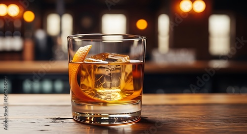 Old Fashioned cocktail with orange peel garnish on a bar top
