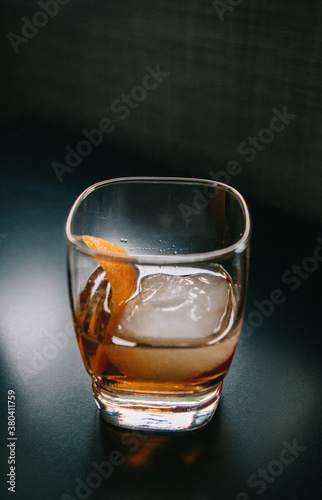 Old Fashioned Drink 2 dashes Bitters, zest of orange, whiskey, sugar cube, ice, stir
