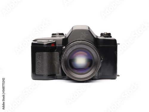 old film slr photo camera with classic 50mm portrait lens on white isolated background