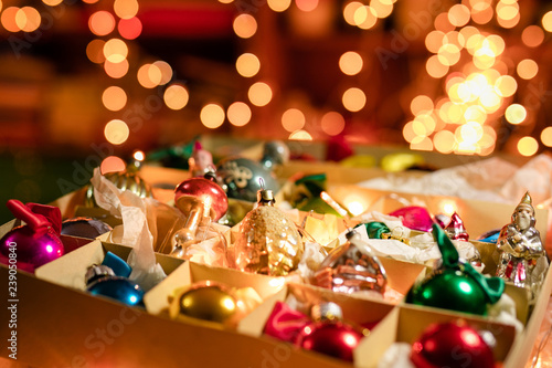 Old glass toys, balls and decoration for the Christmas tree on the paper box. New Year theme