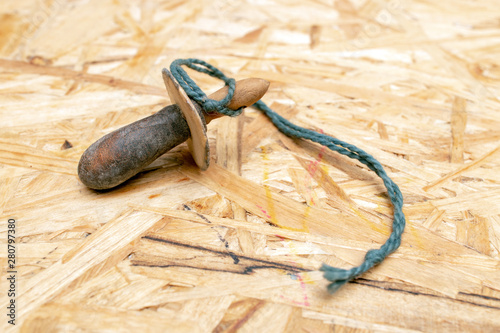 Old handmade child soother made from latex and attached to a woolen string