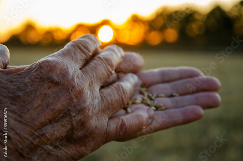 Old leather. Caring for elderly parents. The kind hands of my grandmother. Wheat in old grandmother's palms. Babshuki's wrinkled hands at sunset. Old hands concept. Caring for parents