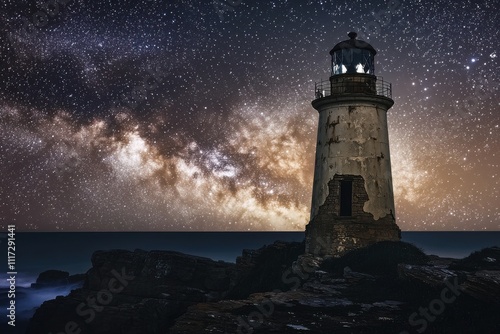 Old lighthouse on rocky coast under the Milky Way. (1)