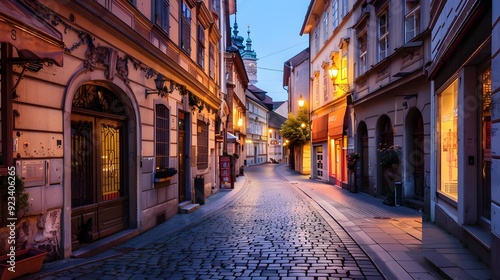 Old Ljubljana cityscape cobbled Ciril-Metodov street evening view. Ljubljana capital of Slovenia.