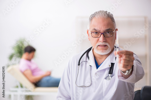 Old male doctor and young male patient in vaccination concept