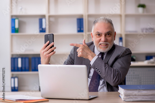 Old male employee speaking by phone at workplace