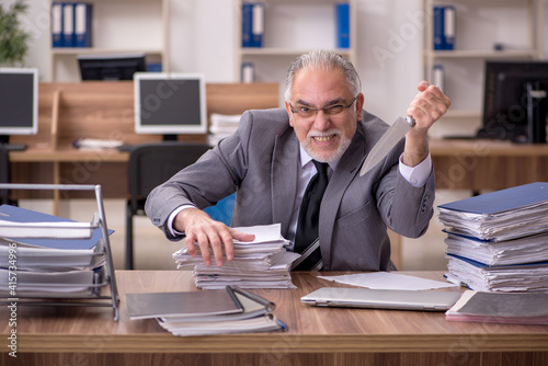 Old male employee unhappy with excessive work in the office