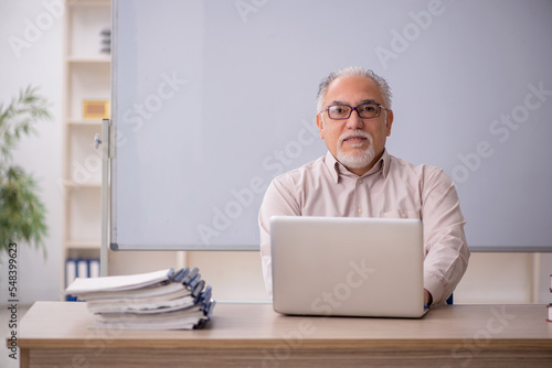 Old male teacher in front of whiteboard