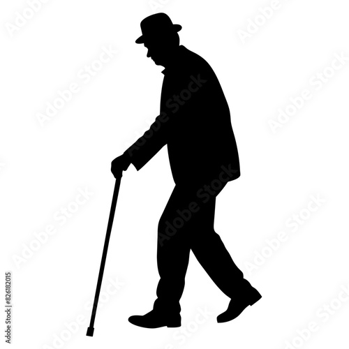 old man walking and relying on a cane, black color vector silhouette set against a white background
