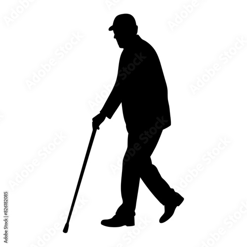 old man walking and relying on a cane, black color vector silhouette set against a white background