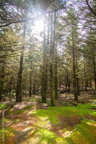 Old misty forest with sun rays