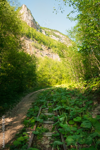 old narrow-gauge railway in the forest in summer overgrown with plants and grass in the Guam gorge of Adygea, the Caucasus