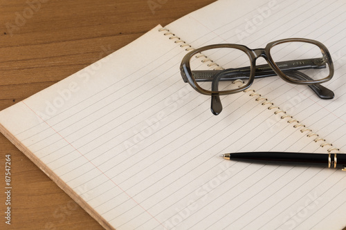 old notebook with pen and glasses on wood table