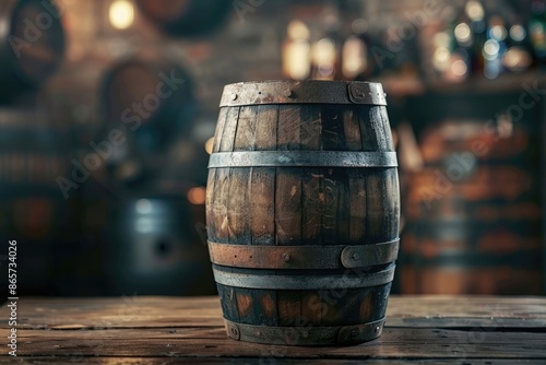 Old oak barrel on wooden table with dark background.