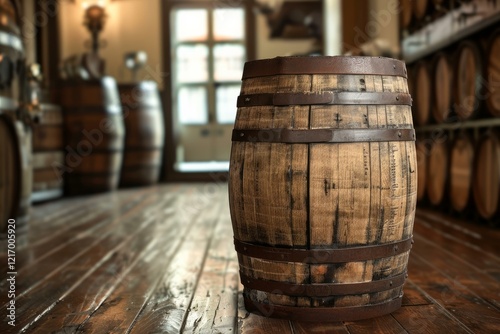 Old oak barrel standing on a wooden floor in a distillery storage room, with other barrels in the background